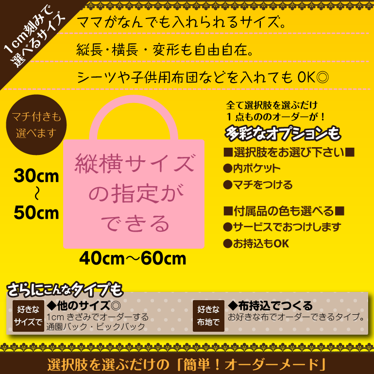 サイズ指定がないならもっと簡単 通園バック・通学バック・レッスンバック etc… お名前シールやお名前プリントも 一緒にオーダーできます。